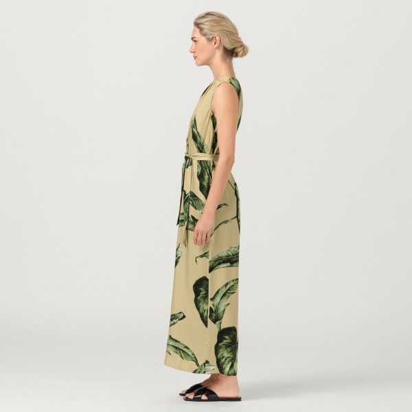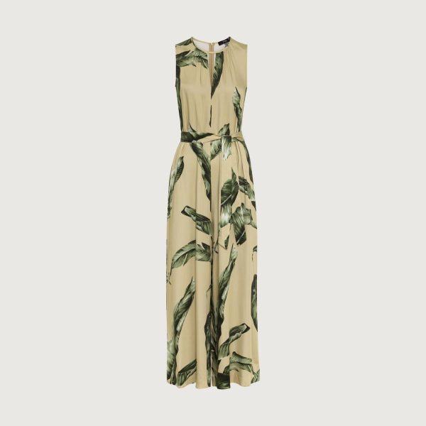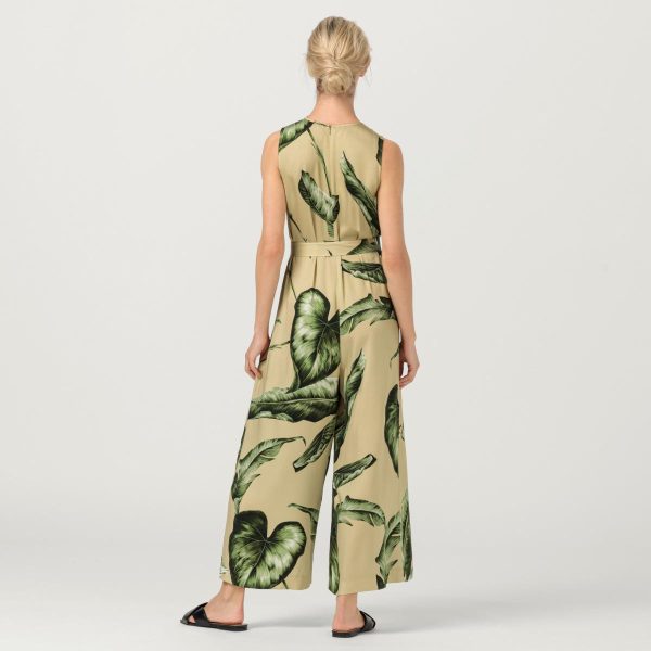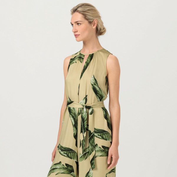 Ärmelloser HALLHUBER Wide-Leg-Overall mit großformatigem Blätterdruck auf weich fließendem Viskose-Satin. Stylisches Design mit feinen Raffungen und V-Cut-out am vorderen Halsausschnitt. Mit Reißverschluss auf der Rückseite für einen bequemes An- und Auskleiden. Das locker fallende Modell kann mit einem Bindegürtel feminin auf Taille gebracht werden.