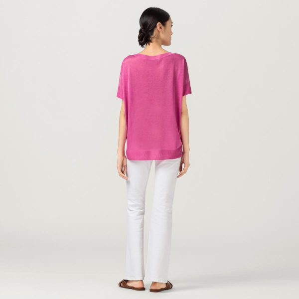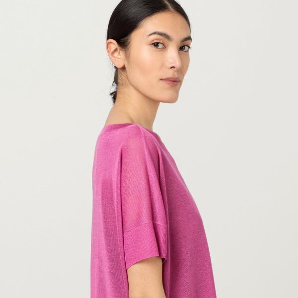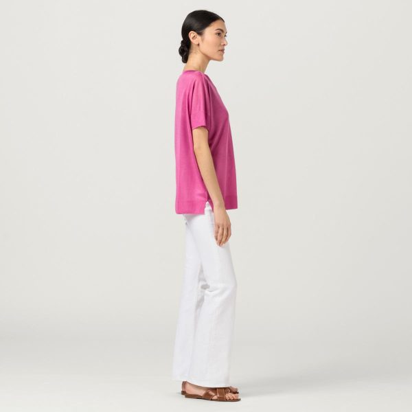 Eyecatcher Piece in Orchid Pink mit vielfältigen Kombinationsmöglichkeiten! Der lässig-weite Feinstrickpullover von HALLHUBER mit U-Boot-Ausschnitt, kurzen Ärmeln und Seitenschlitzen. Das Modell ist aus leicht transparentem Strick aus Lenzing™-EcoVero™-Viskose-Mix gefertigt, feinkörnig in der Haptik und fließend fallend.