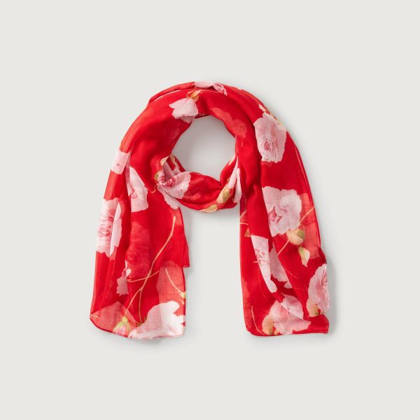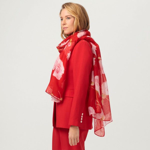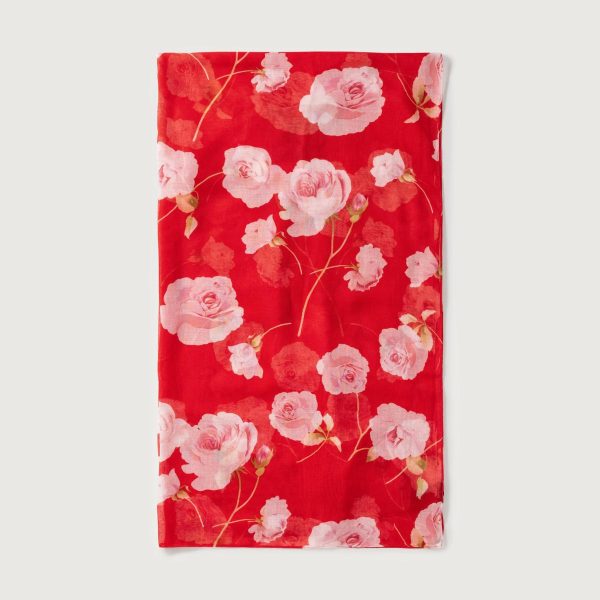 Damenschal mit Rosendruck auf rotem Fonds,
