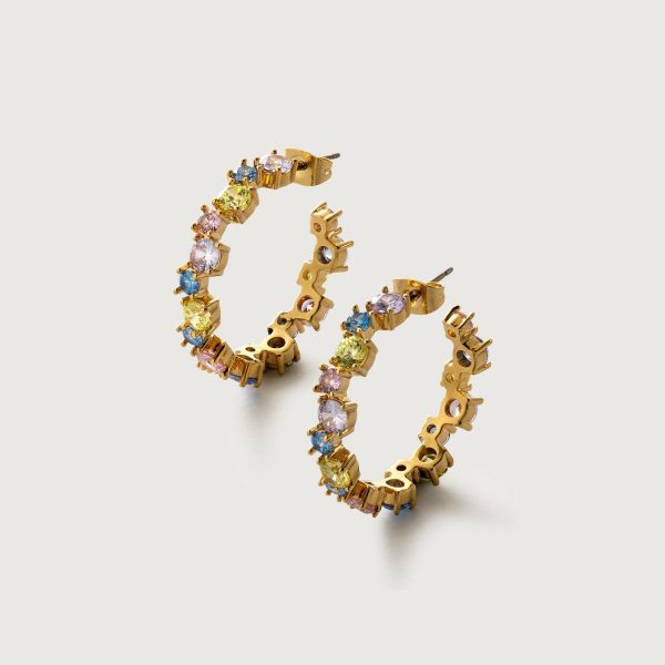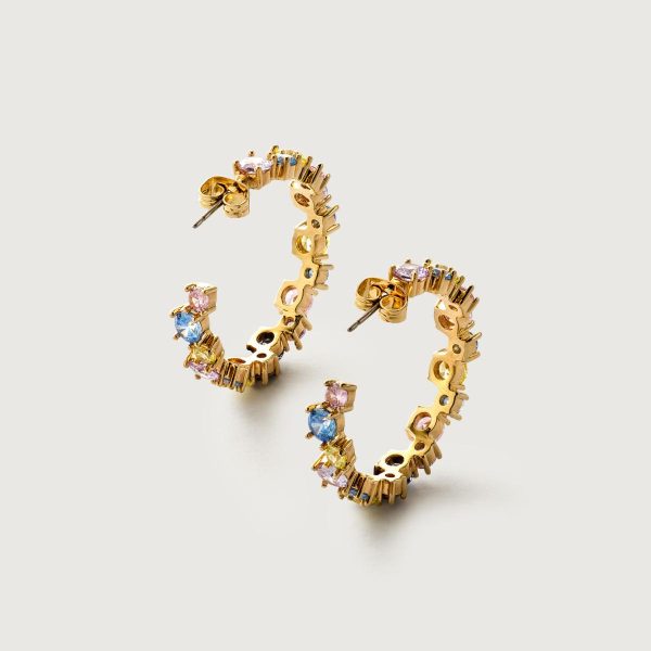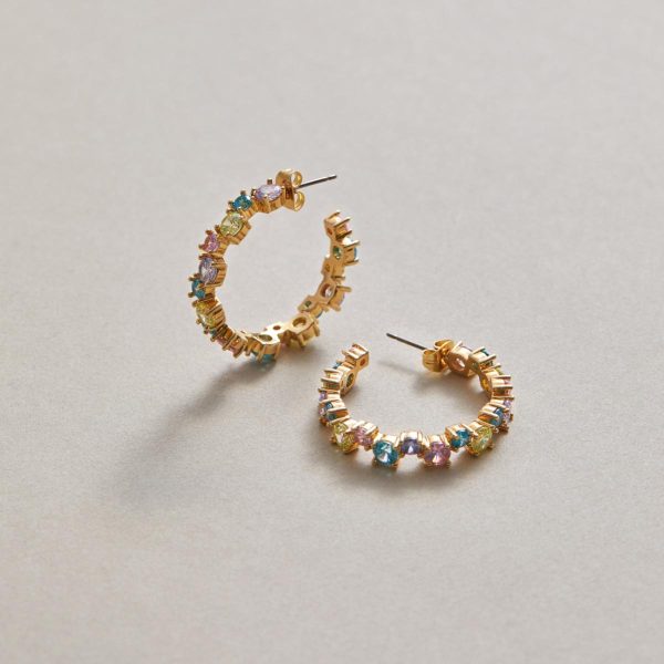 Edles Accessoire in filigranem Design: die 23 Karat vergoldeten HALLHUBER Creolen mit jeweils 18 hochwertig in Krampen gefassten Zirkonia-Steinen in zarten Pastelltönen. Das Paar Steckohrringe lässt sich bequem mit Butterfly-Verschluss am Ohr befestigen und wird zusätzlich mit Silikonstoppern gehalten.