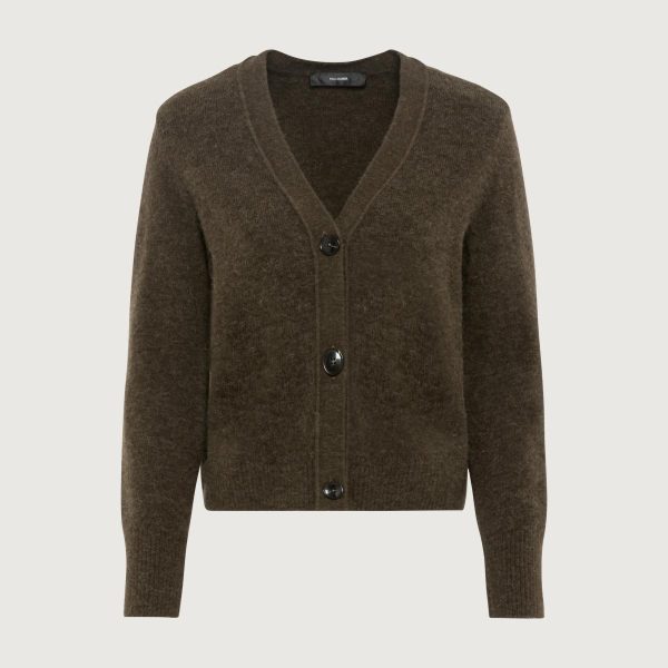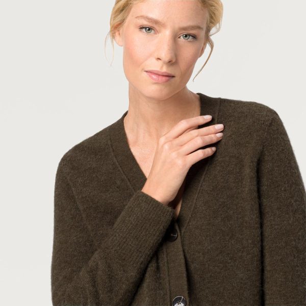 Aus kuschelig-weichem Garn in mulesing-freiem Alpaka-Merinowolle-Mix: die verkürzt geschnittene HALLHUBER Strickjacke mit V-Neck-Design und 3 Knöpfen in Hornoptik. Stylisches Modell, das insbesondere zu High-Waist-Hosen und -Röcken passt.