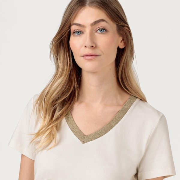 Kult-Shirt einmal anders: das T-Shirt von HALLHUBER im Relaxed Fit mit Lurex-Feinstrickblende am V-Ausschnitt. Das lässige Modell ist aus supersoftem Bio-Baumwolle-Tencel™-Jersey gefertigt und lässt sich easy etwa mit Wide-Leg-Jeans stylen.